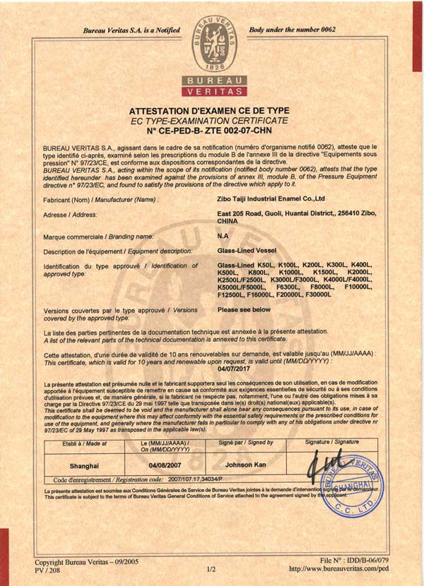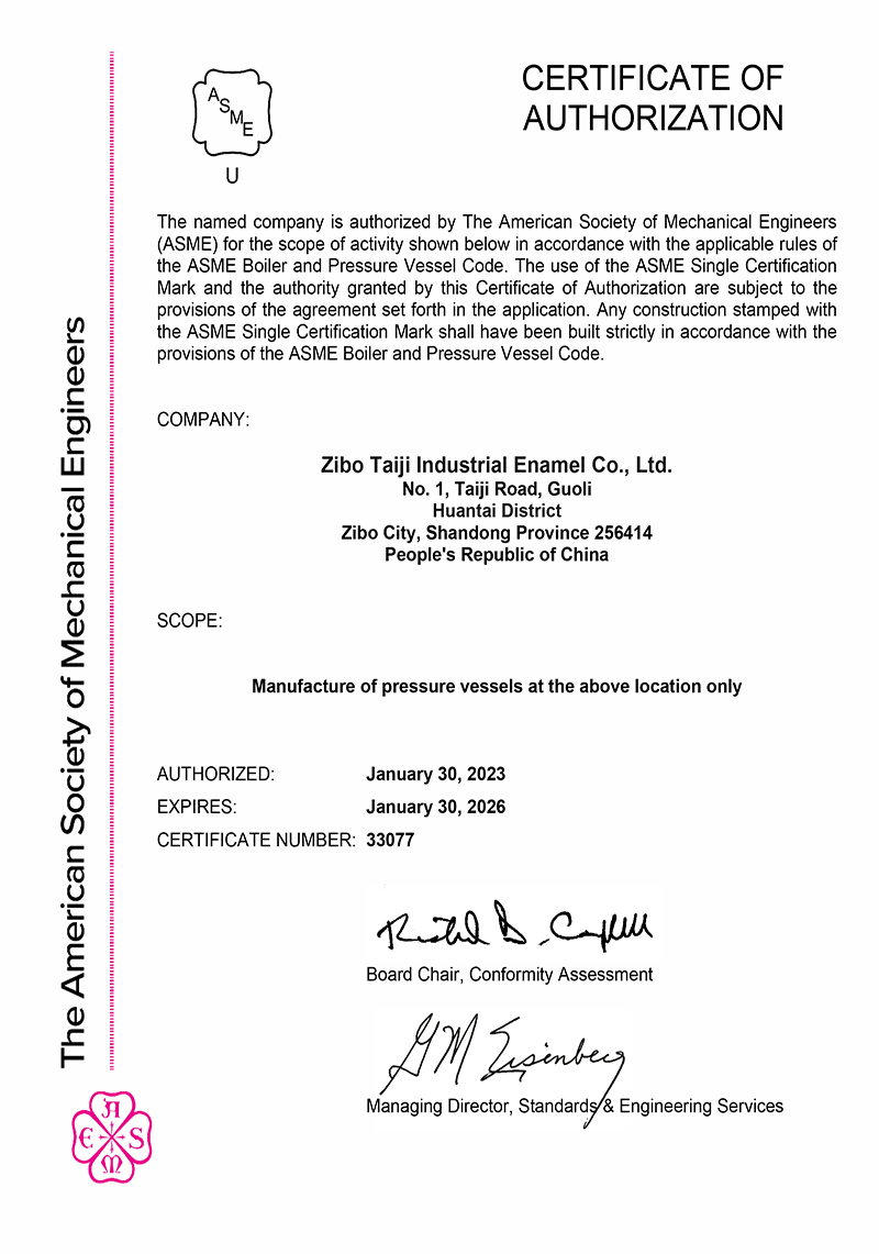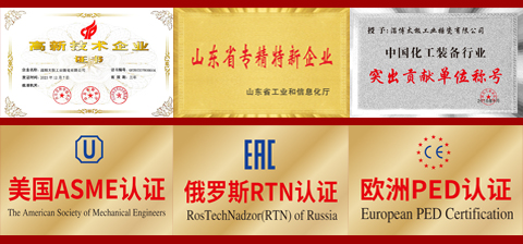 淄博太極在中國搪玻璃設備制造行業(yè)中首家通過ISO90001質量體系認證,并擁有美國ASME認證、歐洲PED認證以及國家部門頒發(fā)的搪玻璃制造許可證、進出口許可證和百余項榮譽證以及三十六項專利等。